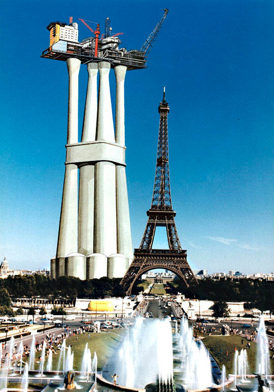 Bandingkan juga tinggi dari beberapa anjungan minyak lainnya dengan bangunan-bangunan tertinggi di dunia ("Troll A" tidak ada dalam gambar, tapi tingginya mencapai 472 meter):